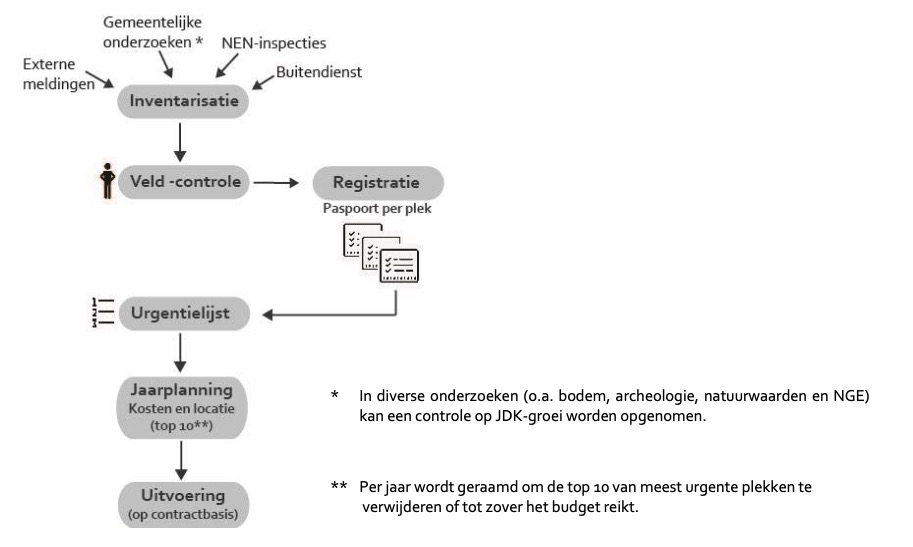 - Nu/tijdig ingrijpen hogere kosten op de langere termijn voorkomt. Een actieve en professionele aanpak vraagt een hogere investering in de eerste jaren. Hiermee neem je vaak ook direct eventuele risico's weg, het areaal breidt zich niet meer uit waarmee een toename van (herstel)kosten wordt voorkomen. Veelal kan binnen enkele jaren (afhankelijk van de aanpak en omvang van het areaal) de exoot als beheergroep binnen de gemeentelijke exploitatie opgenomen worden.