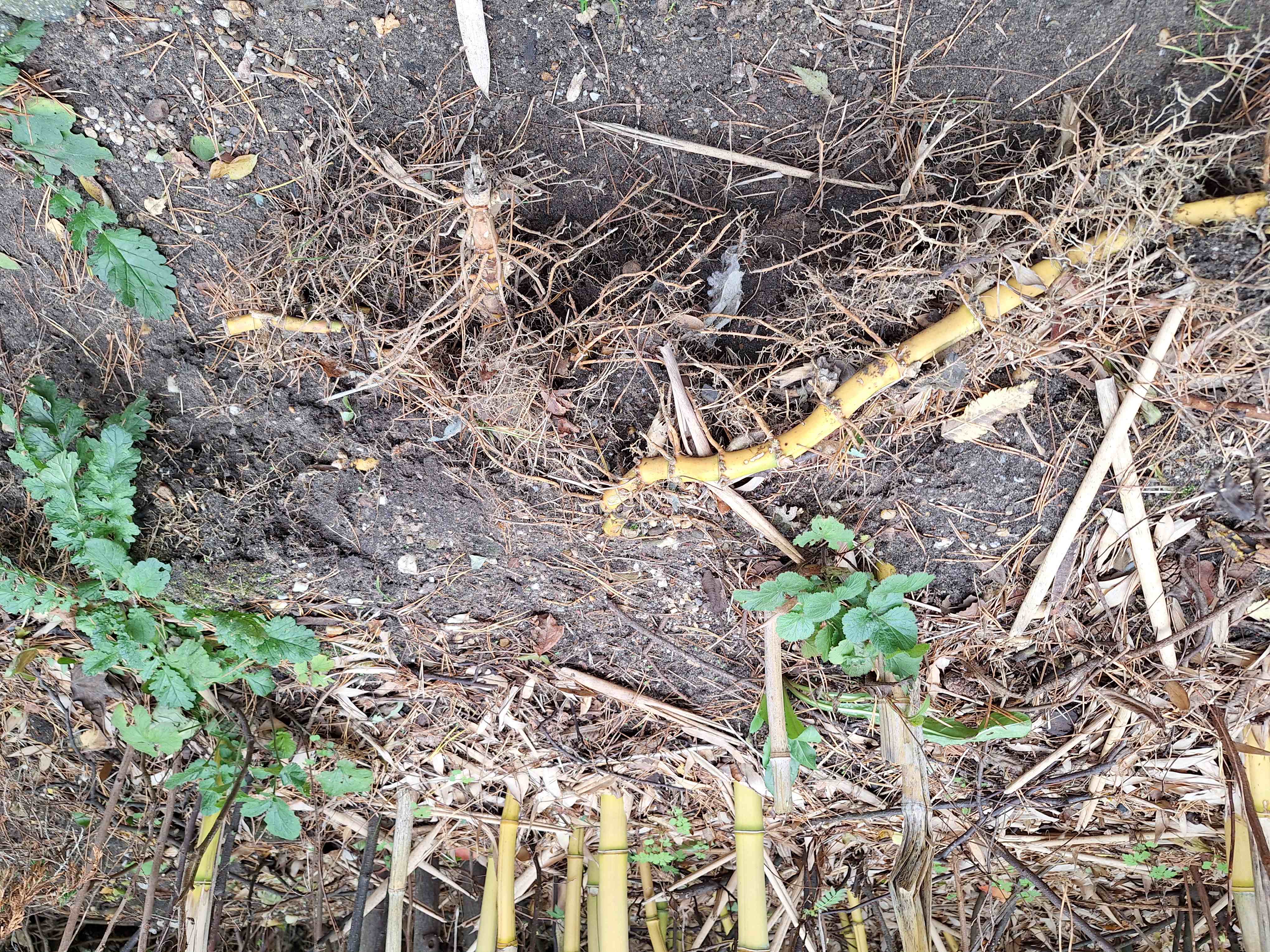 - Wortels: De wortelstokken van bamboe groeien vrij oppervlakkig, dicht onder het maaiveld en kunnen schade veroorzaken aan bouwwerken, leidingen en wegen.