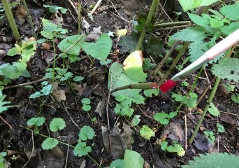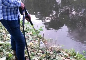 - Uittrekken en ontwortelen - Machinaal- Het grootste deel van de wortelstokken van Aziatische duizendknoop zit in de bovenste 20 tot 40 cm van de bodem. Met een wortelriek aan een minigraver kunnen de grovere delen van deze wortelstokken grotendeels worden verwijderd. Achterblijvende stukjes wortelstok zullen weer uitlopen, die worden vervolgens eens per maand uitgestoken. Dat gaat gemakkelijk omdat de grond los is. Om concurrentie te bieden, kan de locatie ingezaaid worden met inheemse planten.