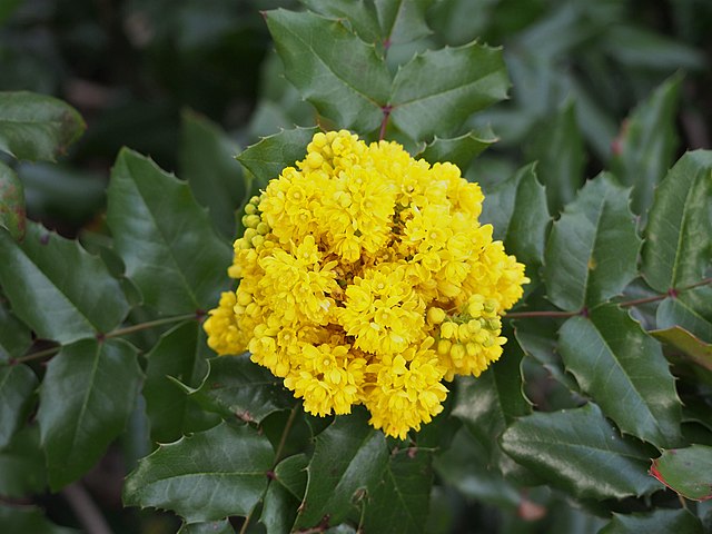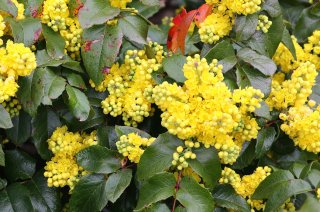 Mahonie (Berberis aquifolium, ook wel bekend onder de oude naam Mahonia aquifolium) is een wintergroene, grillig vertakte struik die tot 1,5 m hoog kan worden. Aan het uiteinde van de bruingekleurde takken zitten kransen van samengestelde, oneven geveerde bladeren. De leerachtige, donkergroene bladeren zijn 6-7 cm lang en hebben een sterk gestekelde bladrand. Verder vormt de doornstruik trossen met gele, sterk geurende bloemen die aan het uiteinde van de takken staan. De blauwe bessen verschijnen na de bloei.