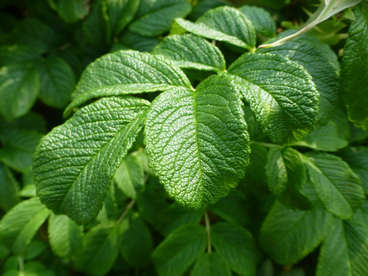 De bladeren zijn oneven geveerd met 5 tot 9 elliptische, gerimpelde deelblaadjes. Elk deelblaadje is 1,5-3 cm breed en 2-5 cm lang met een enkelvoudig gezaagde bladrand en een licht afgeronde bladvoet. De nerven zijn vrij diep ingekerfd in het blad. Van boven zijn de deelblaadjes niet behaard en donkergroen van kleur. Aan de onderkant is het blad dicht behaard en blauwgroen van kleur.