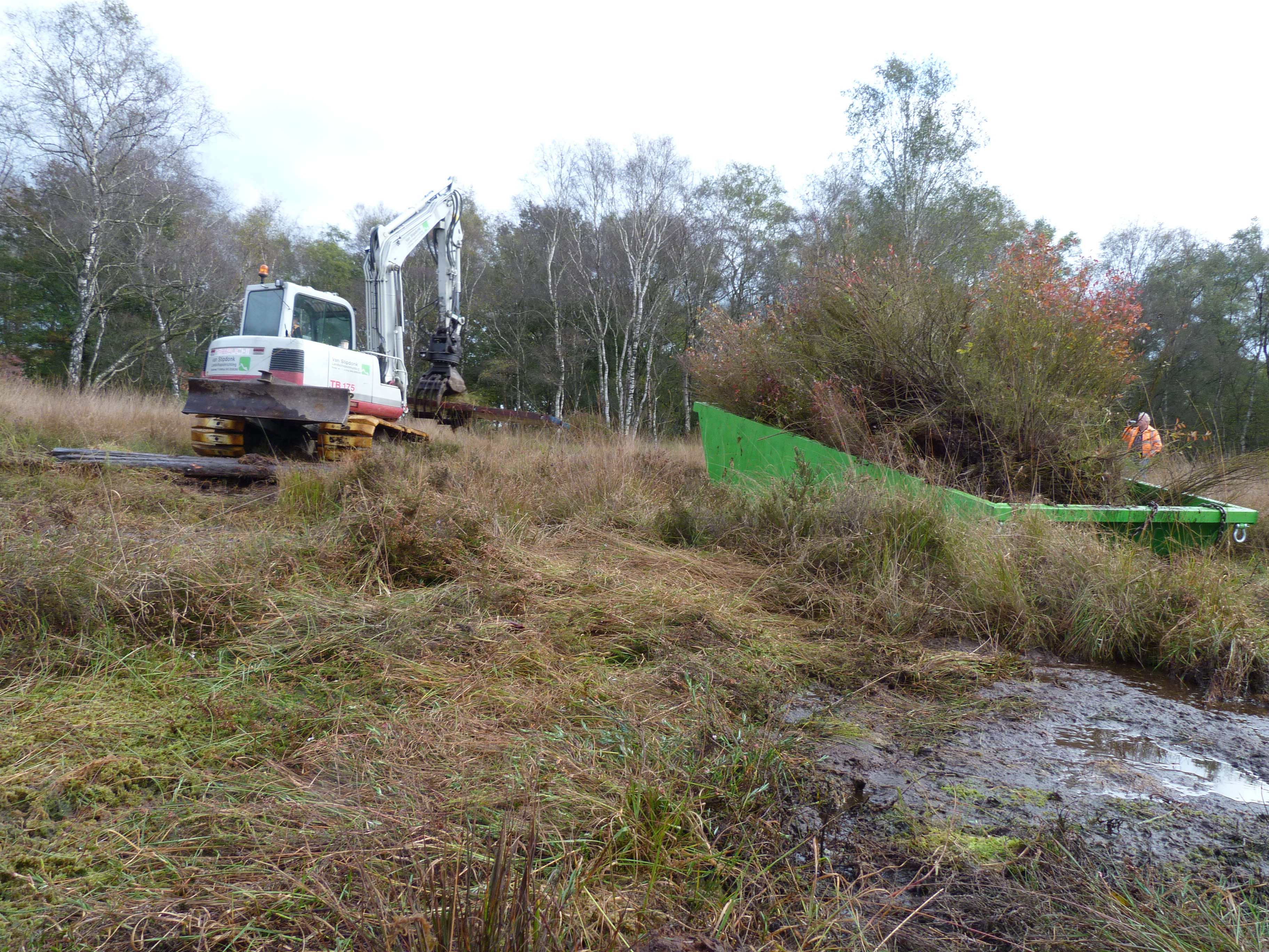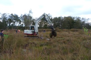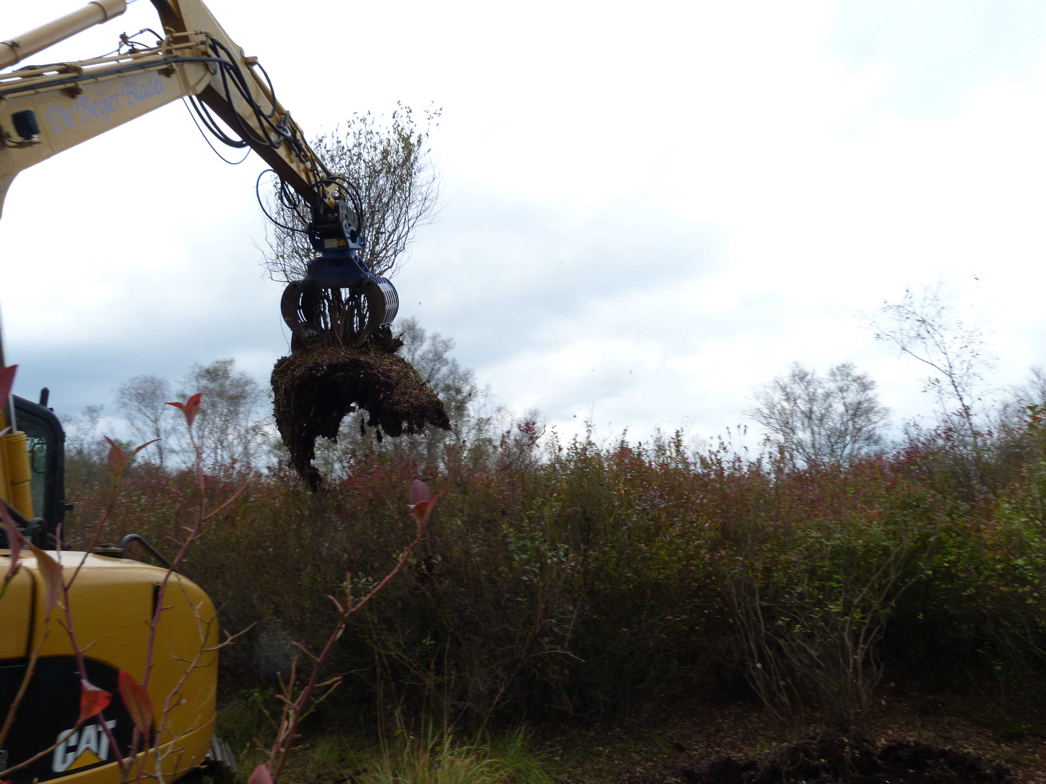 - Het verwijderen van de struiken met een rupskraan en sorteerknijper heeft een flinke impact op het gebied: het uittrekken en de afvoer van de struiken laten sporen na in het terrein.