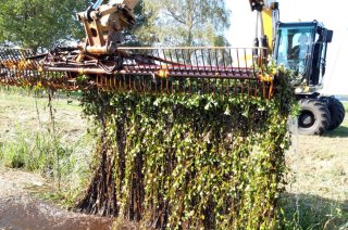 Machinaal verwijderen wordt voornamelijk ingezet als de matten te groot en te zwaar zijn geworden om handmatig te verwijderen. Voorkom fragmentatie en gebruik een grijper of maaikorf zonder snijfunctie. Als gewerkt wordt met een boot niet door de planten varen.